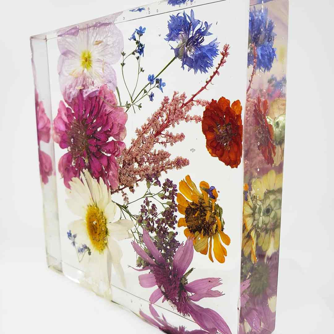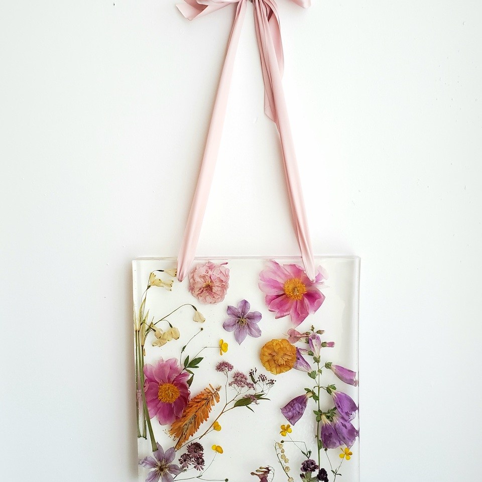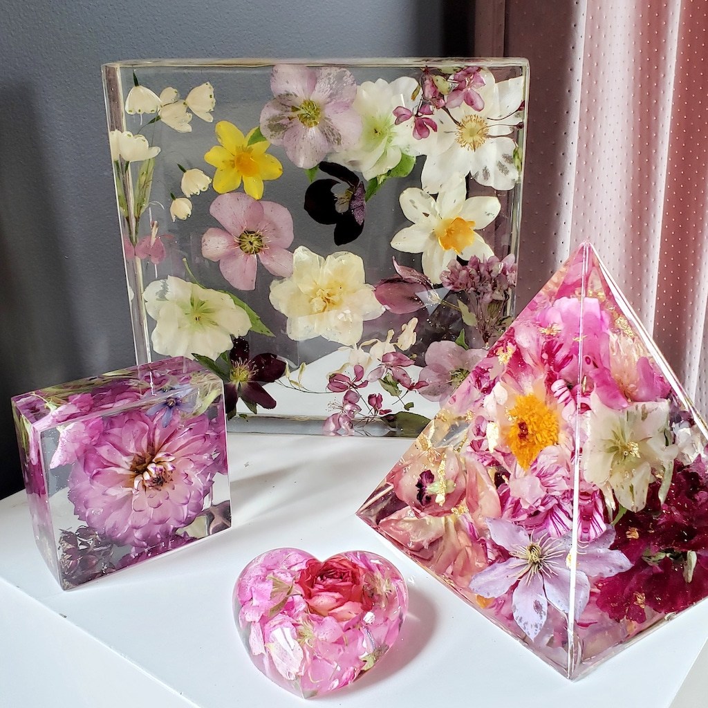 White Jasmine Lab specializes in floral preservation using clear epoxy resin to create unique, heirloom art pieces for clients. The finished product showcases flowers suspended in layers of clear resin as if they were perfectly frozen in glass. They have several sizes to choose from, including 3″ ornaments, 6″ wall hangings, and 9″ square pieces. Clients may choose to drop off their own flowers at Pittsburgh, PA studio, or they can send photos for a Bouquet Remake order. White Jasmine Lab looks forward to creating custom art with flowers that are special to you!