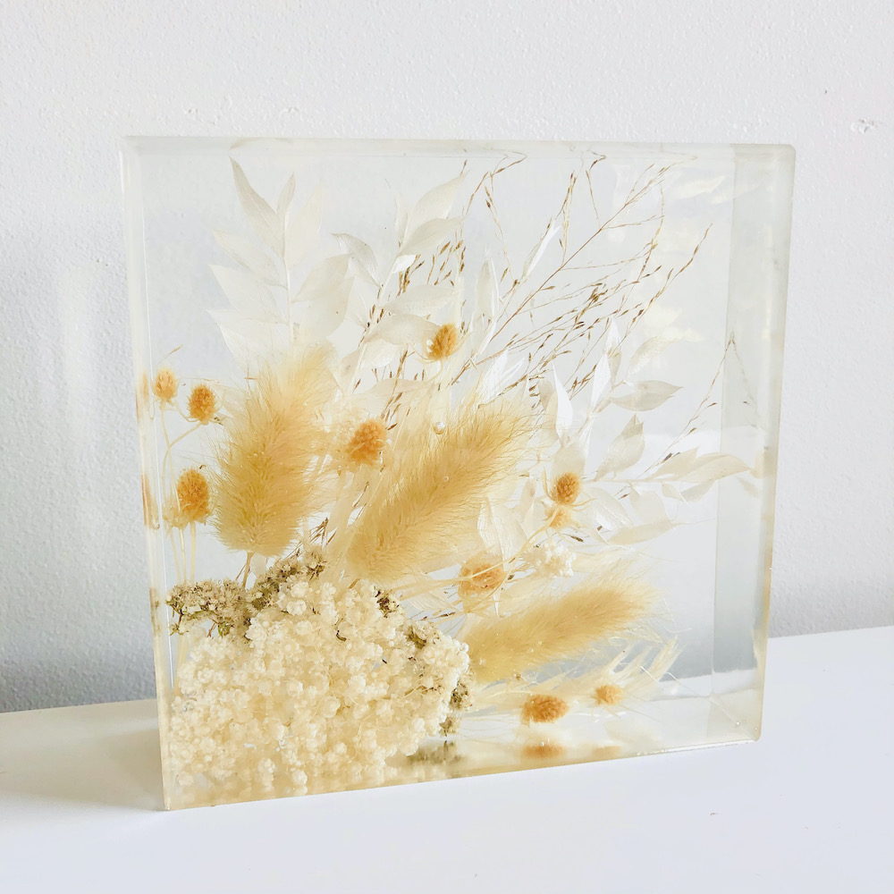 In the lead up to my own wedding I was looking for a way to preserve my bouquet to keep as a memory for years to come. After I couldn’t find anyone locally to preserve it in the way I envisioned, I taught myself, began to fall in love with working with resin and started Saluto.