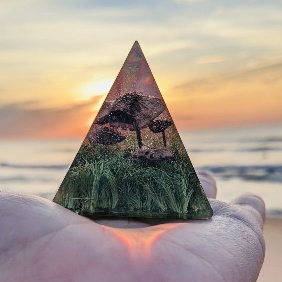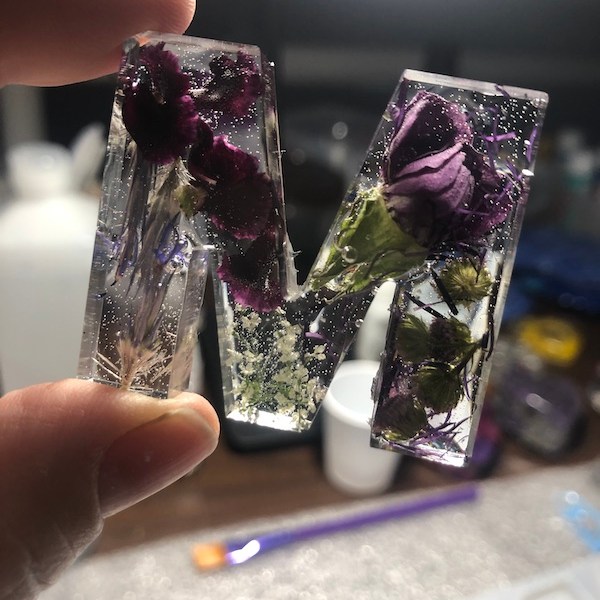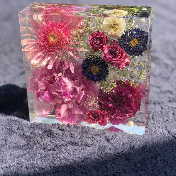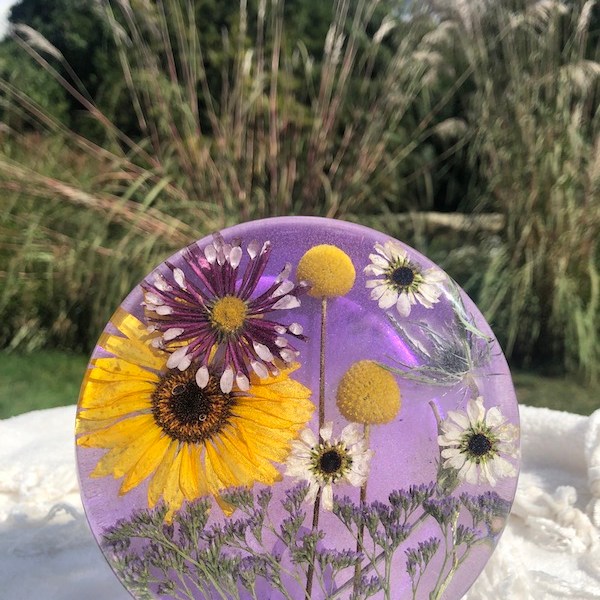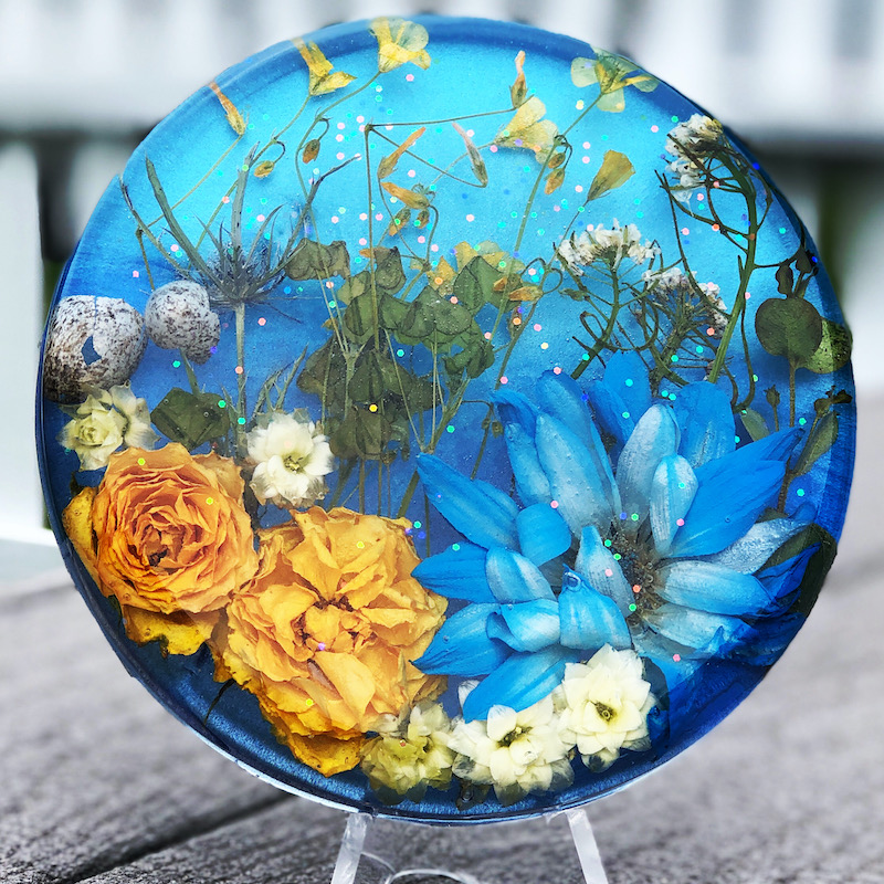 Michelle fell in love with floral resin work during the quarantine. She taught herself the process and hasn’t looked back. Every free moment you can find her in her loft at her table foraging though all of her dried flowers.