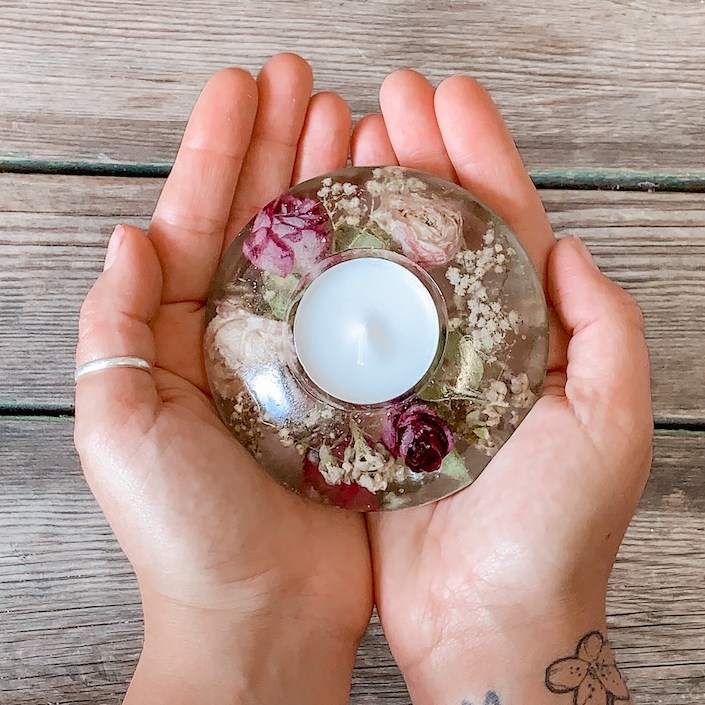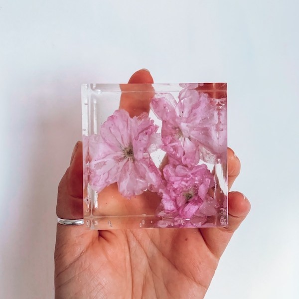 She began her career in resin art when her obsession with the ocean and nature met with a discovery of fluid art, starting with acrylic pouring and finding its way to resin. Her life-long love for flowers led to experimenting with resin casting, and she then found a very special way to preserve flowers inside resin shapes, capturing them most often exactly as they would have been in a bouquet or garden. Her mum, and bestie, also shares her flower obsession, and she helps out at Sarah Ashleigh Designs HQ! Her mum will take in your flower deliveries, and sort and dry them before Sarah casts them.